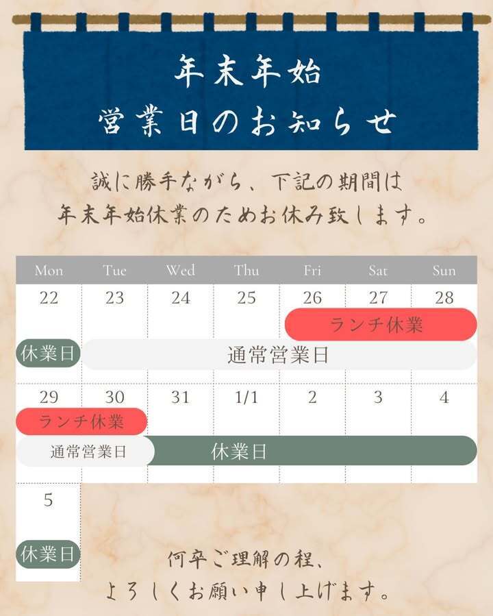 年末年始の営業は12月30日まで夜営業、1月6日のランチ営業から再開となります。